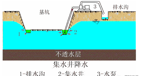 明溝加集水井降水是一種人工排降法。它具有施工方便,用具簡單,費用低廉的特點,在施工現(xiàn)場應(yīng)用的普遍。在高水位地區(qū)基坑邊坡支護工程中,這種方法往往作為阻擋法或其他降水方法的輔助排降水措施,它主要排除地下潛水、施工用水和天降雨水。